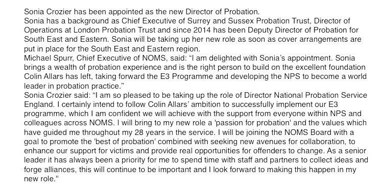 ReplyDeleteThis is very good news. Sonia Crozier replacing Collin Allars as Director of Probation couldn't be a better outcome. This is what we need, probation officers heading the probation service.
